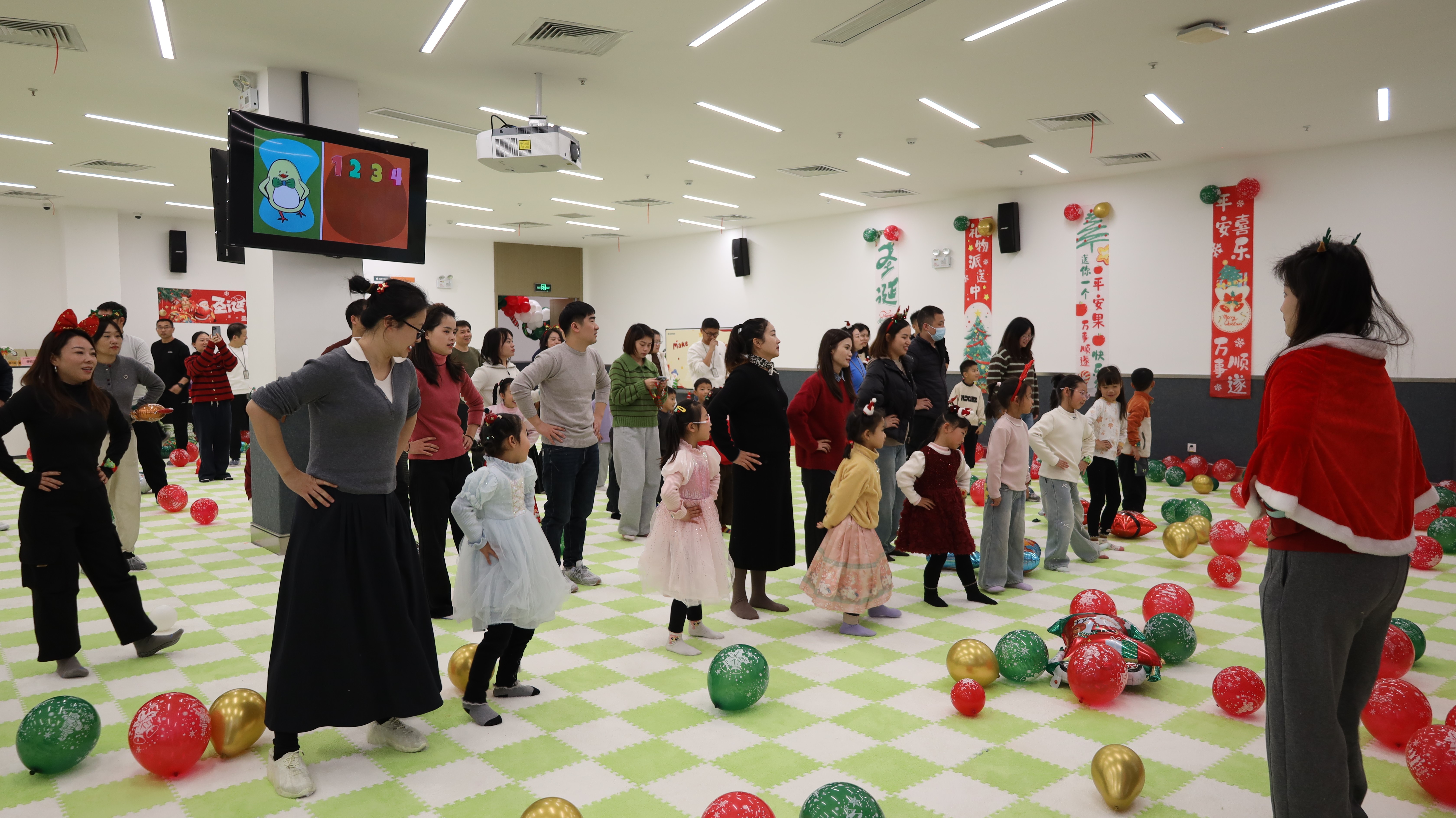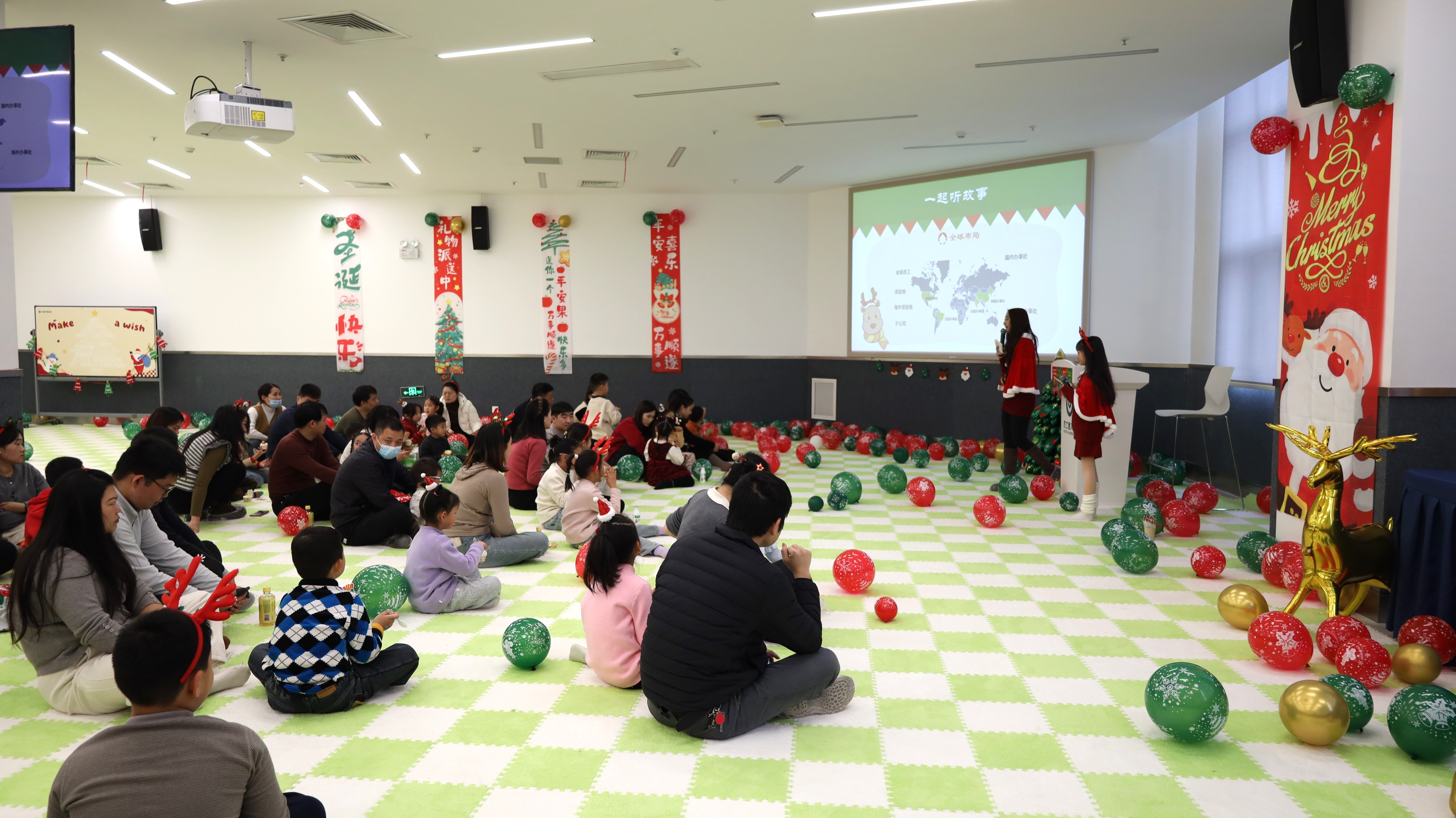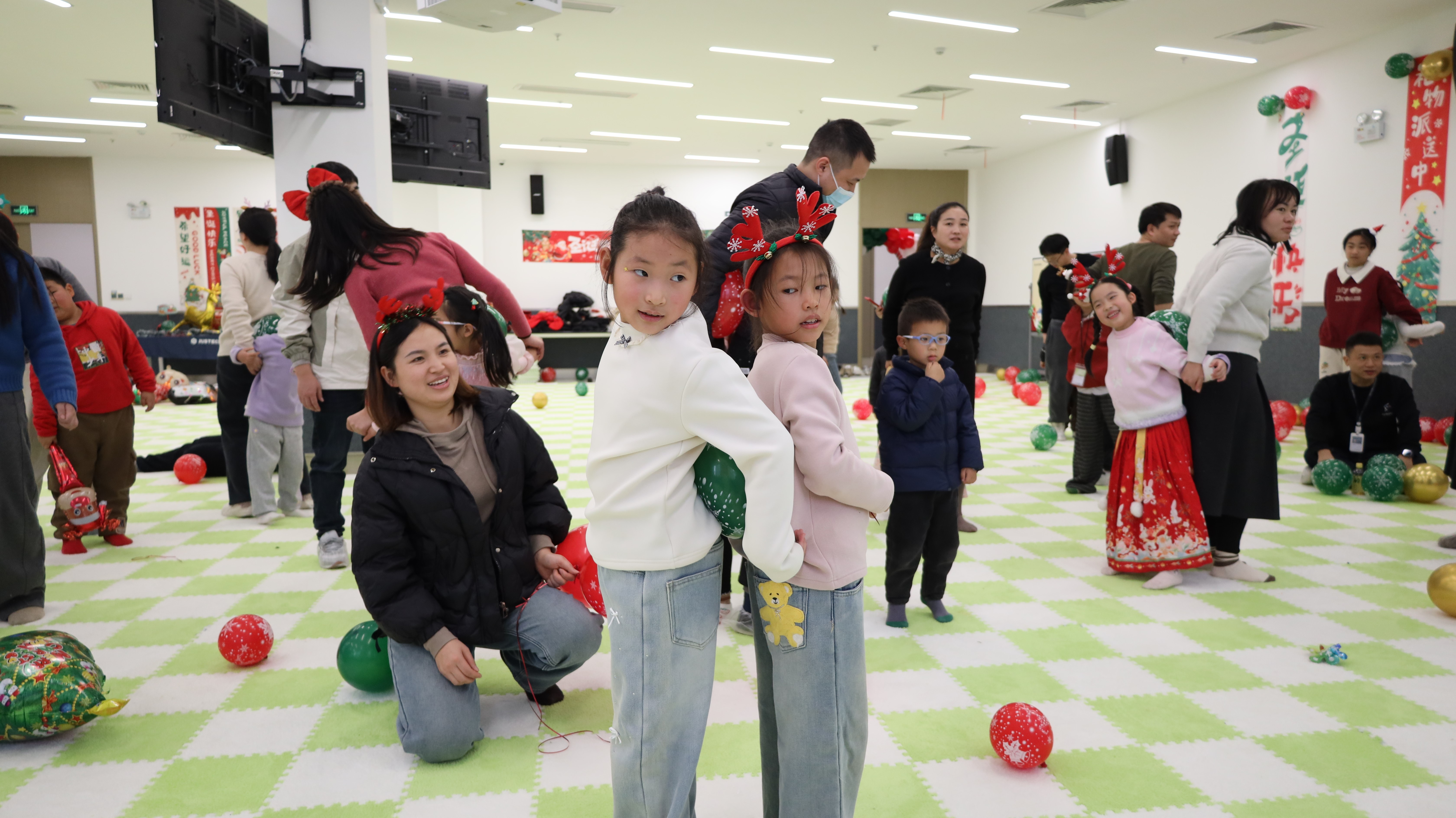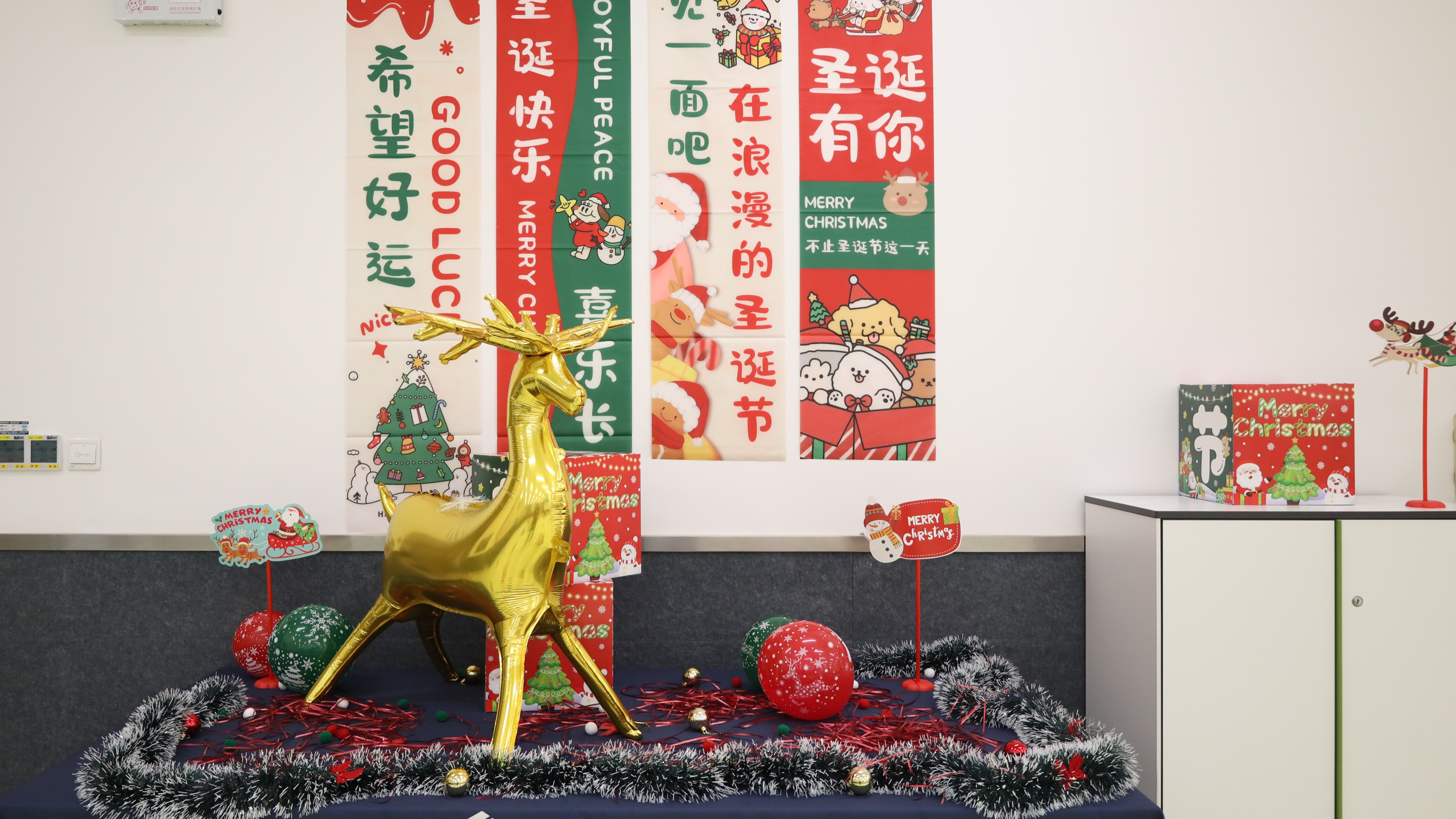 踏入活动现场,浓厚的圣诞氛围瞬间扑面而来:醒目而贴心的指引牌静静矗立,缤纷气球与节日装饰错落点缀,每一处细节都蕴藏着巧思与心意。