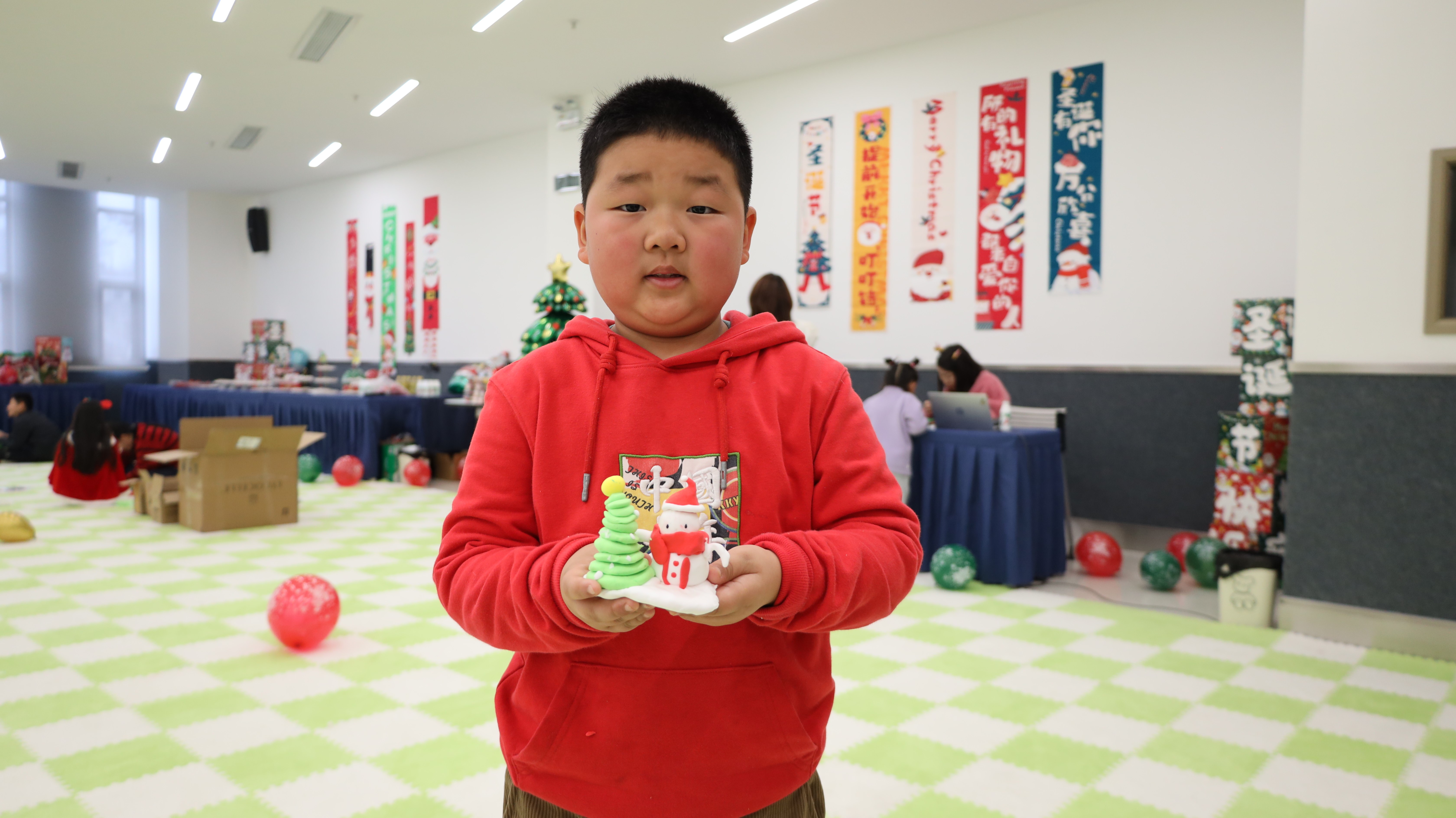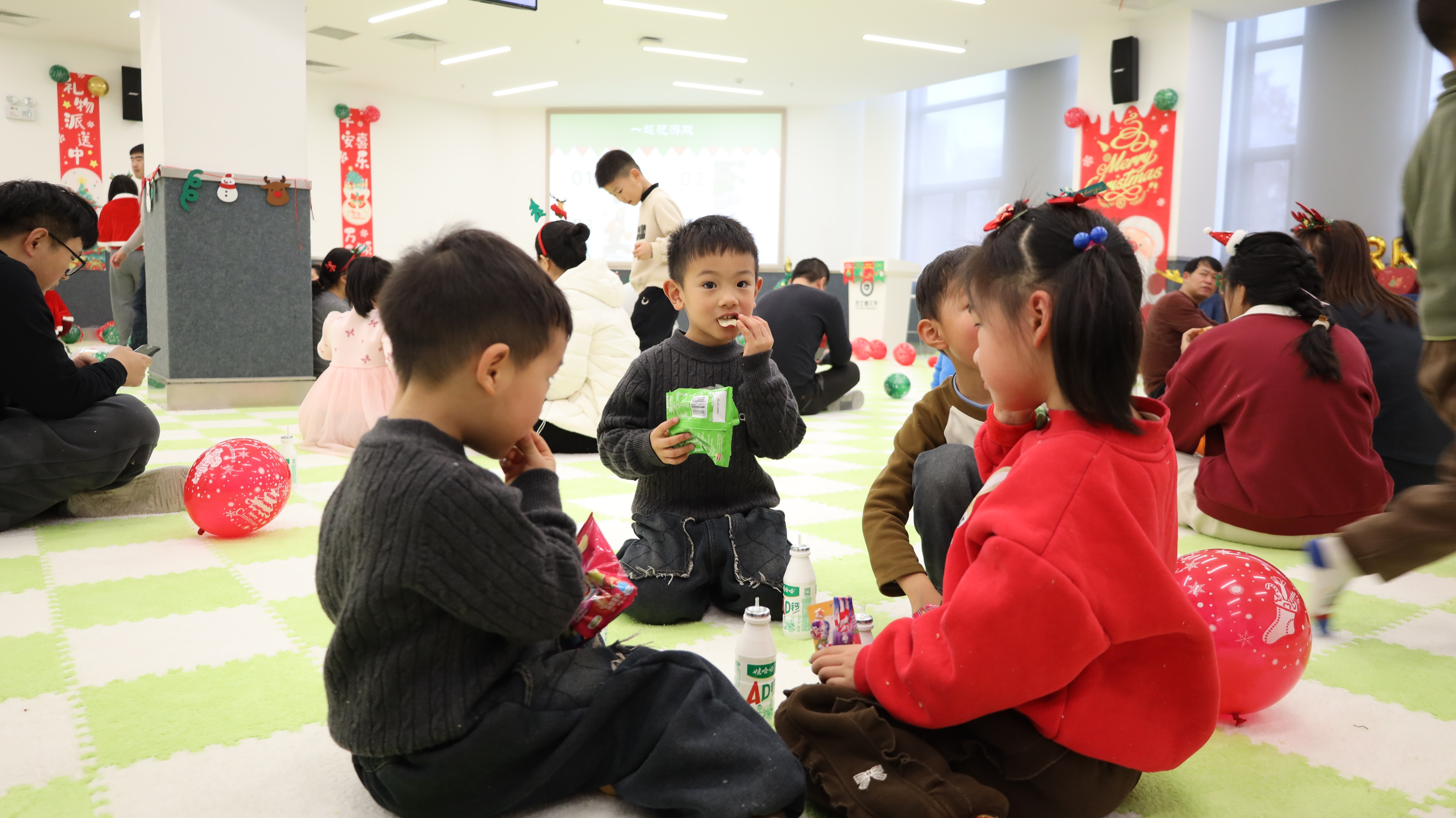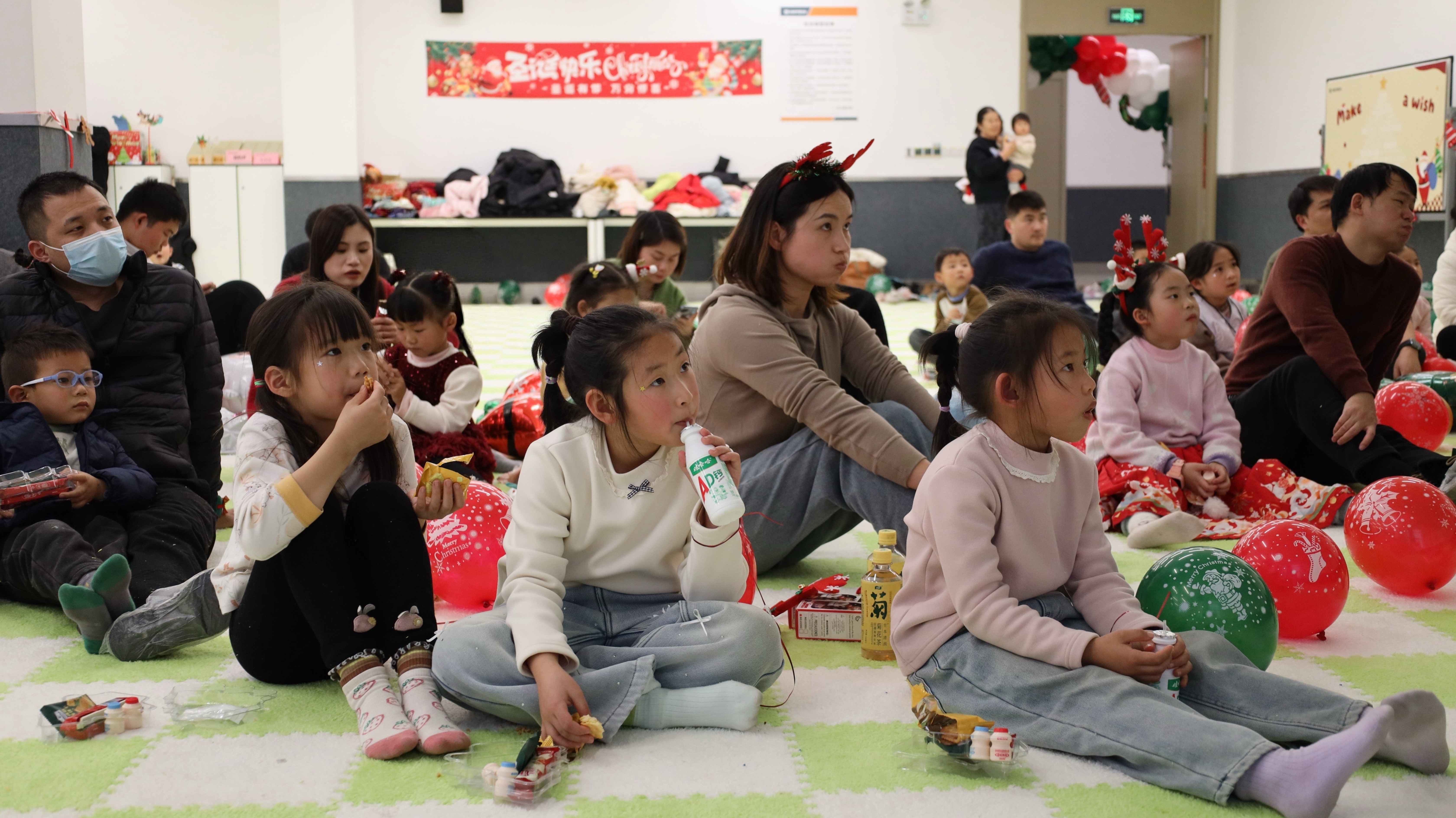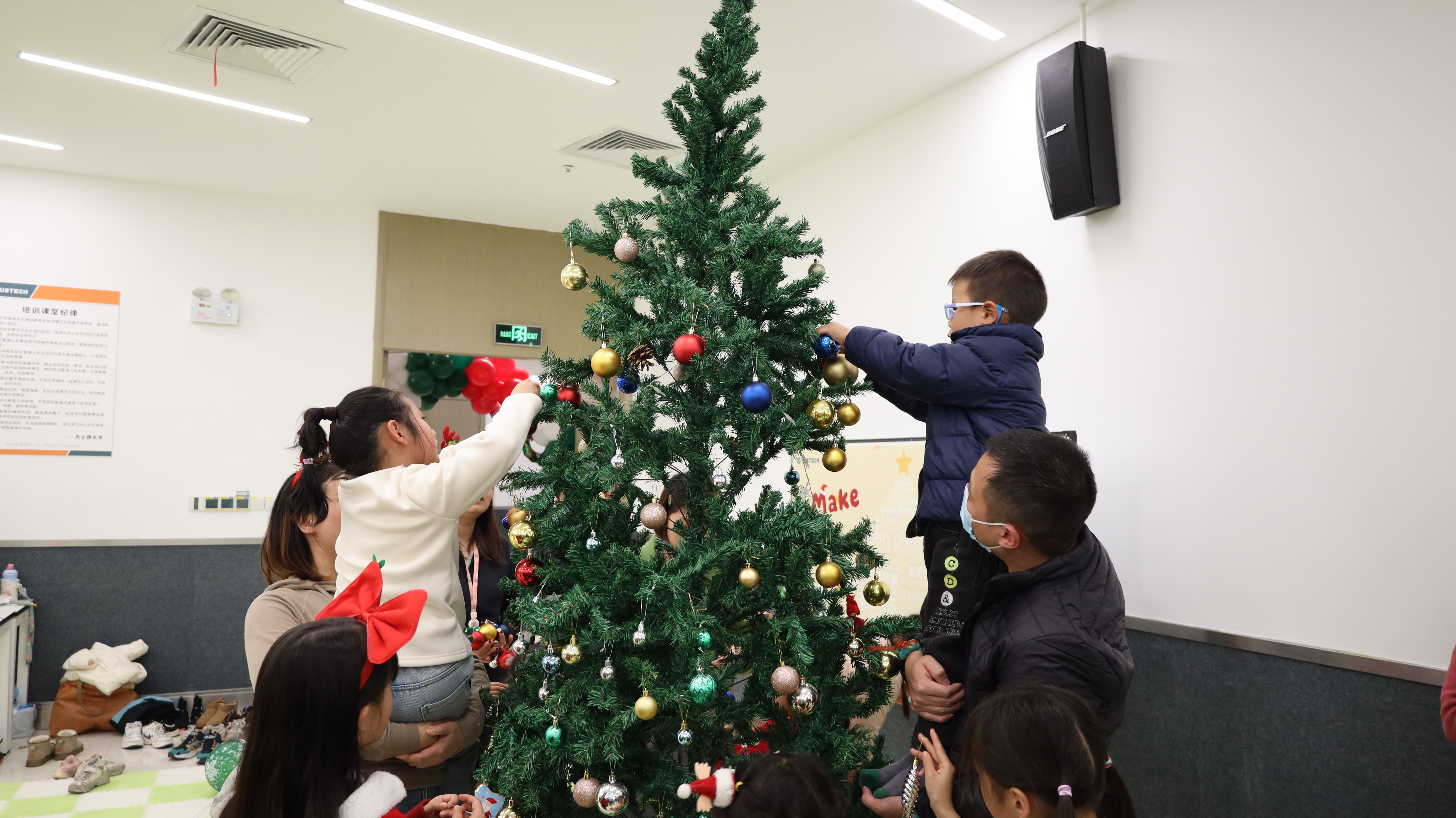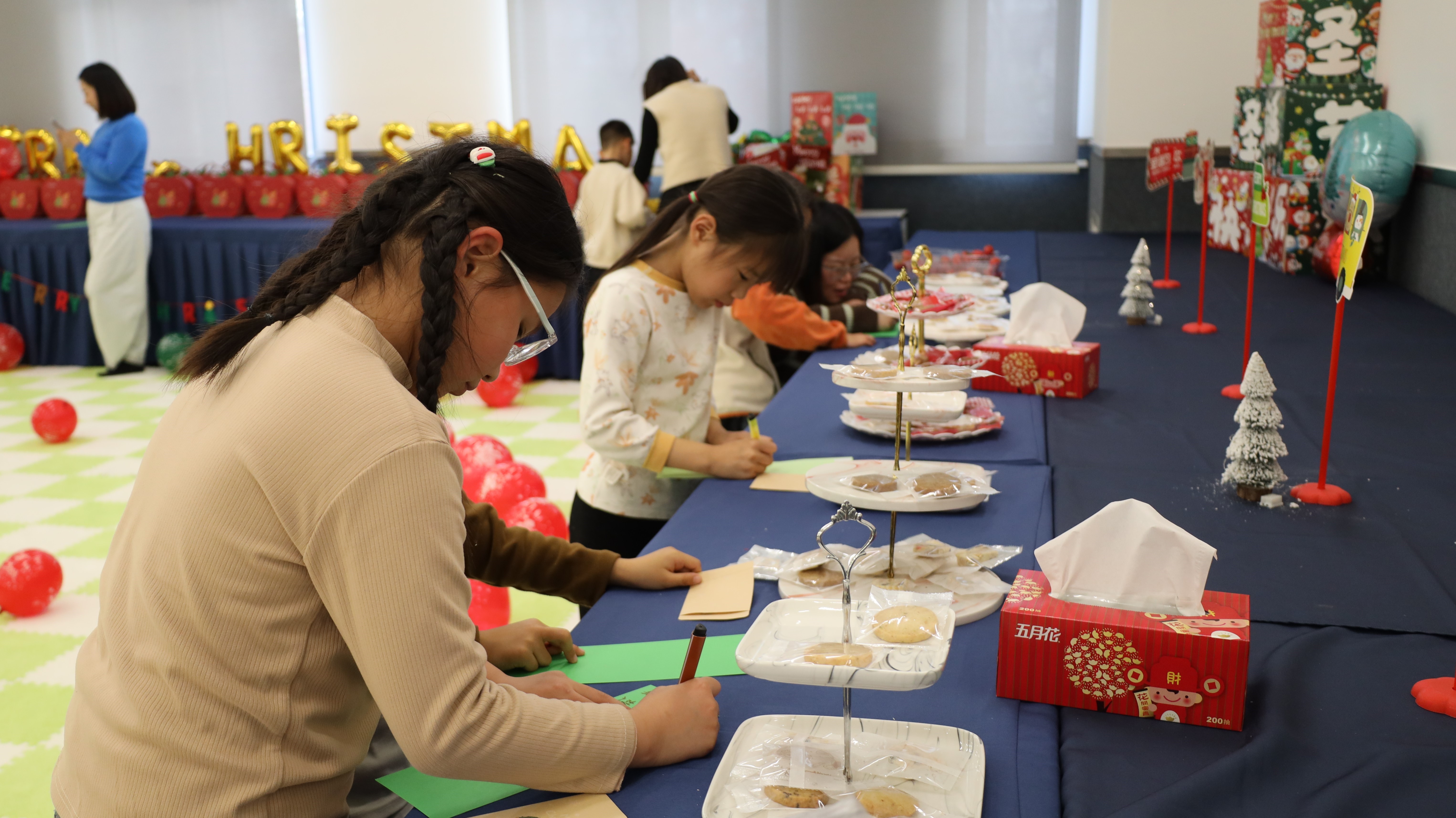 踏入活动现场,浓厚的圣诞氛围瞬间扑面而来:醒目而贴心的指引牌静静矗立,缤纷气球与节日装饰错落点缀,每一处细节都蕴藏着巧思与心意。
