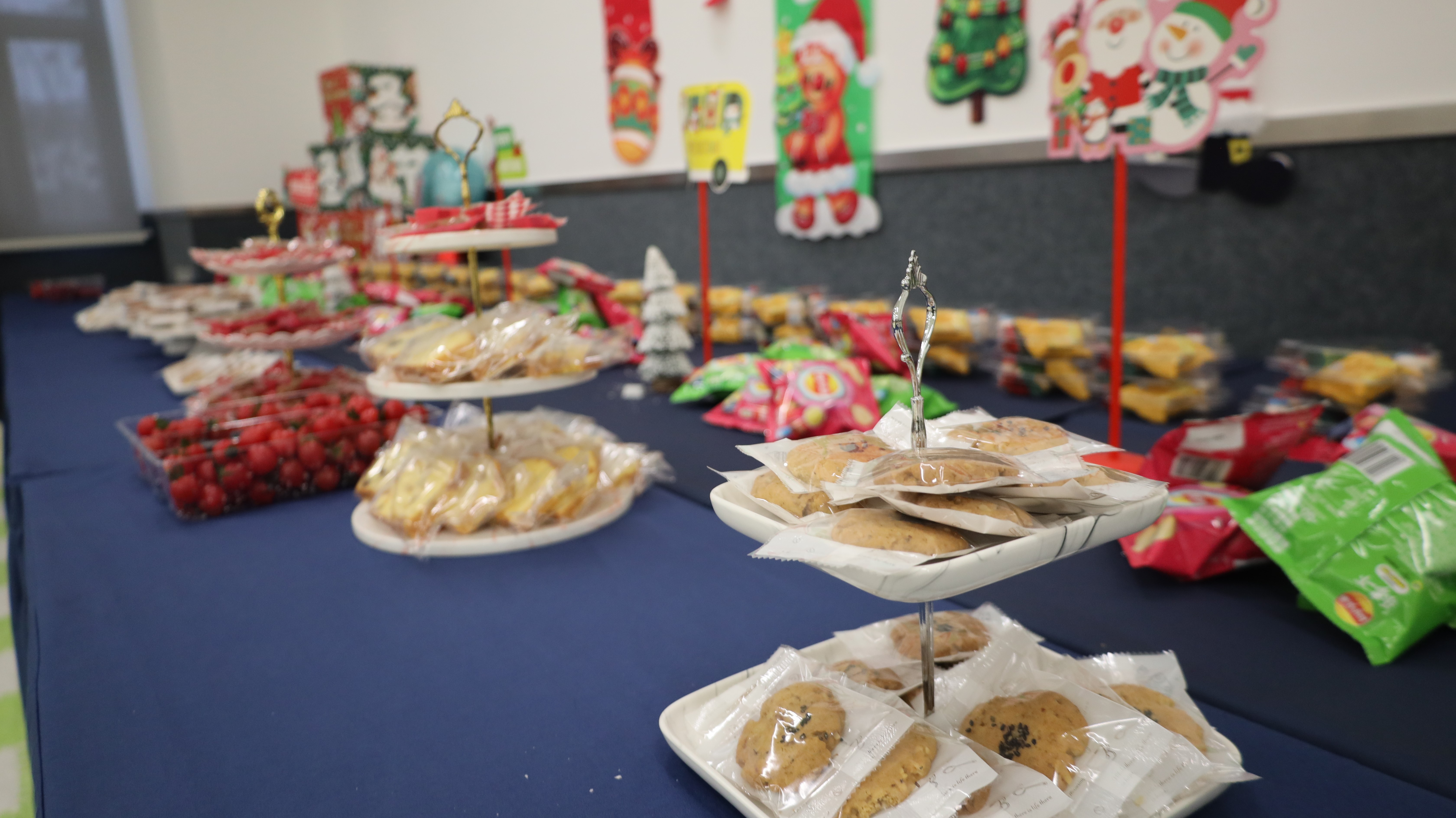 随着指引穿过缀满气球与彩带的拱门,便进入温馨的主会场。脚下柔软的毛绒地毯托起欢快的步伐,耳畔萦绕着轻快的圣诞乐章,圣诞老人挂布仿佛在静静讲述节日的童话。琳琅满目的茶歇甜品点缀其间,为这场相聚染上了一层甜蜜的期待。
