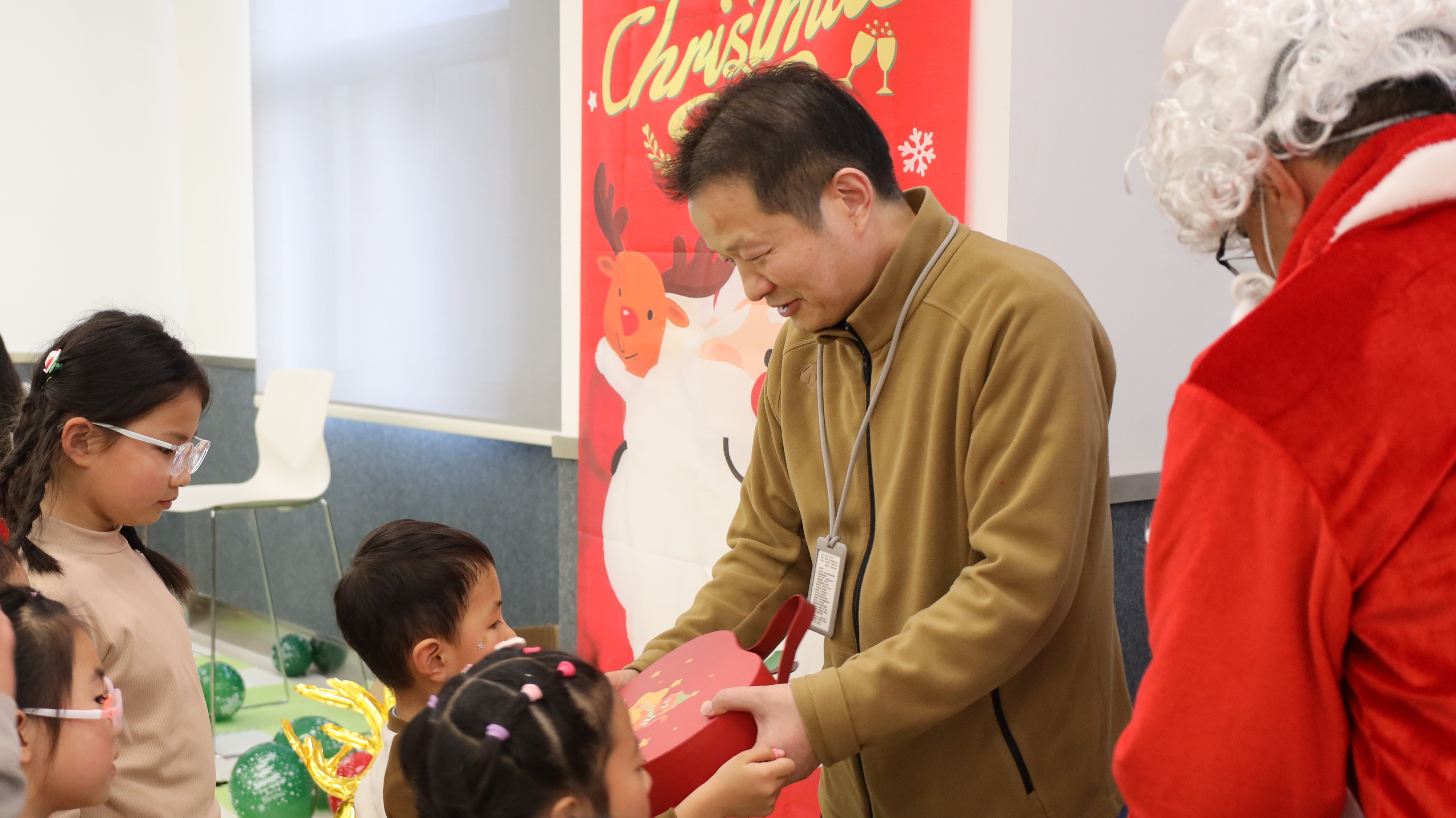 伴随着温馨的音乐,魏校长与圣诞老人一同为每个家庭送上精心准备的伴手礼。孩子们手捧礼物,笑脸盈盈;家长们满心欢喜,温情满满。最后,全体参与家庭在璀璨的圣诞树前合影留念,“圣诞快乐”的欢呼声久久回荡在现场,将这份温暖与欢乐永远定格。