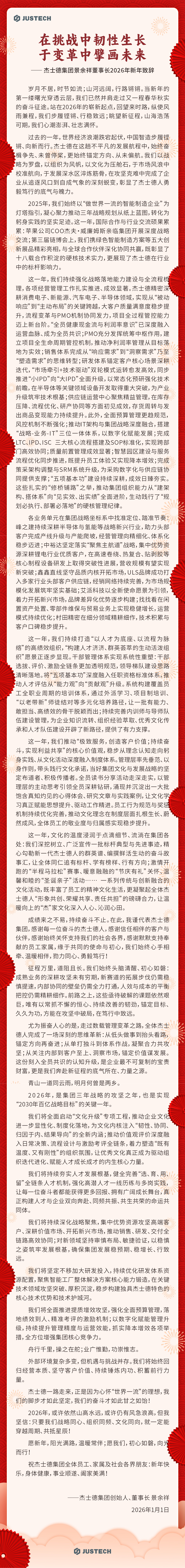 在挑战中韧性生长,于变革中擘画未来——杰士德集团景余祥董事长2026年新年致辞
