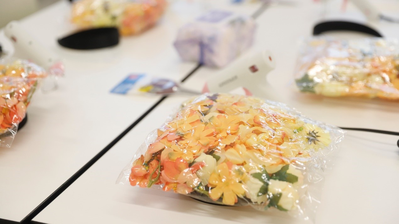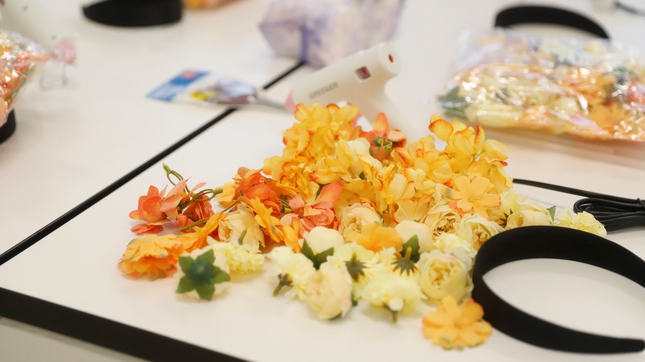 “非遗簪花DIY”区域最先热闹起来。长桌上铺满了各式各样的绢花,琳琅满目,每个位置前都放着一把热熔胶枪,细细的胶棒正等着被融化,变成连接花朵与发箍的桥梁。