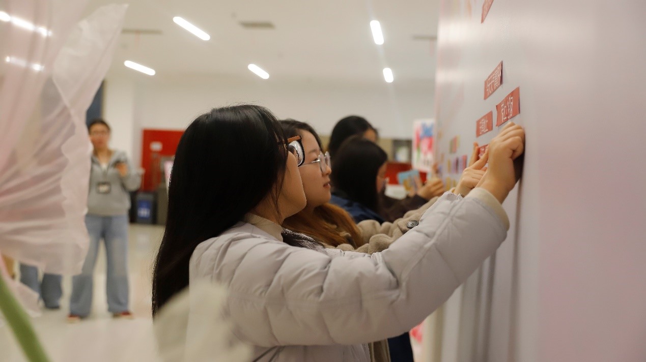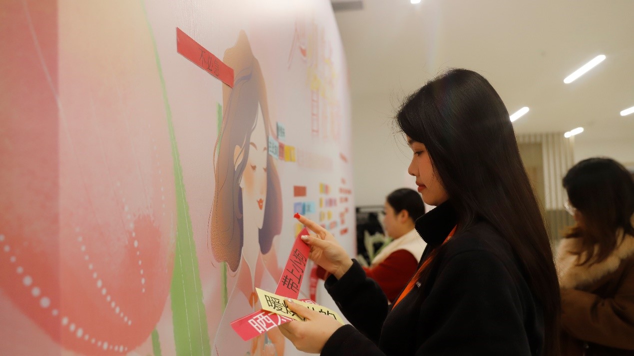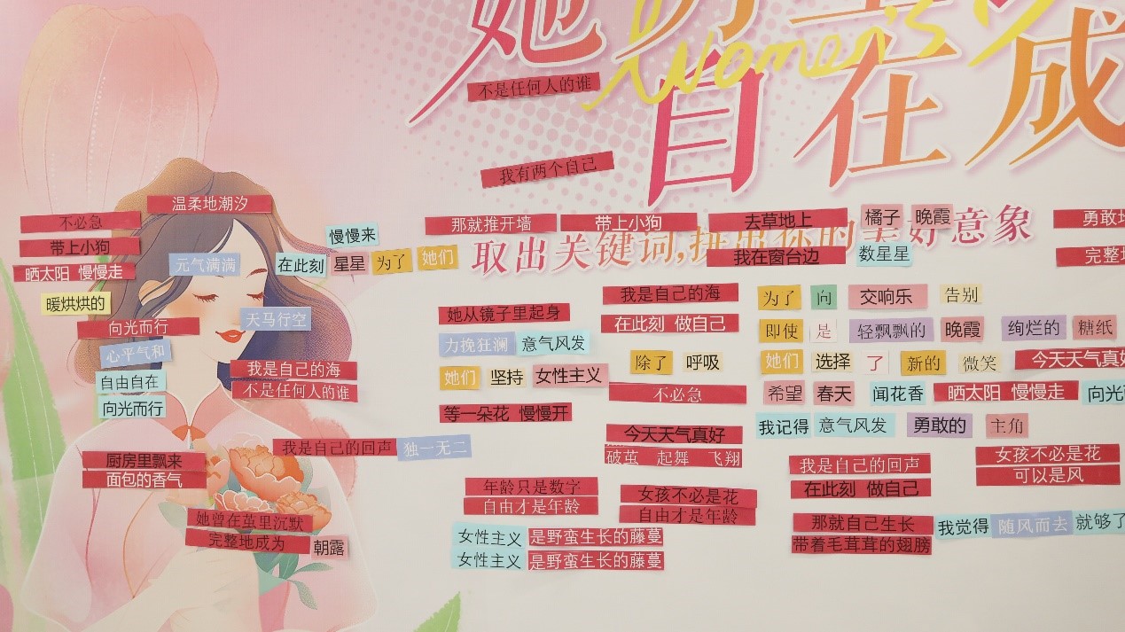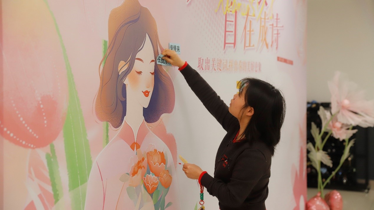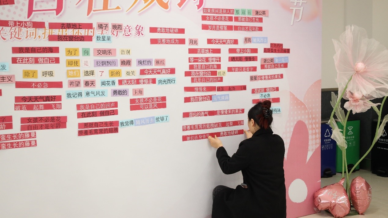 上午9点,活动区渐渐热闹起来。女员工们三三两两结伴而来,看到签到区独特的布置,纷纷好奇。在工作人员的引导下,大家细细翻看着每一张卡片,用心搭配属于自己的节日诗句。有人拈起“春天”,又配上一枚“问花香”;有人选了“自由自在”,再寻一朵“向光而行”;还有人偏爱“乘风破浪”,将两张卡片并排贴在墙中央。她们或低头沉思,或与同伴轻声商讨,不时传来阵阵笑声。