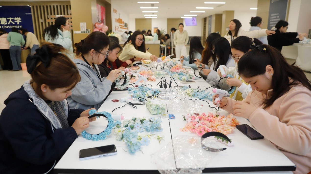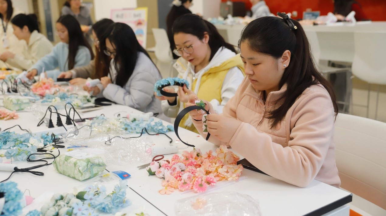 领取材料包后,女员工们围坐一圈,开始了一场与美的对话。有人低头沉思,指尖轻轻捻起一朵淡粉色的绢花;有人与邻座轻声交流,互相参谋配色与造型。热熔胶枪“滋滋”轻响,花朵在发箍上渐次绽放。一时间,满室皆是“花香”笑语。有人簪着牡丹,端庄雍容;有人小心翼翼,仿佛怕惊扰了花瓣上的春意。发间的花朵与脸上的笑靥交相辉映,整个空间仿佛变成了一个姹紫嫣红的春日花园。