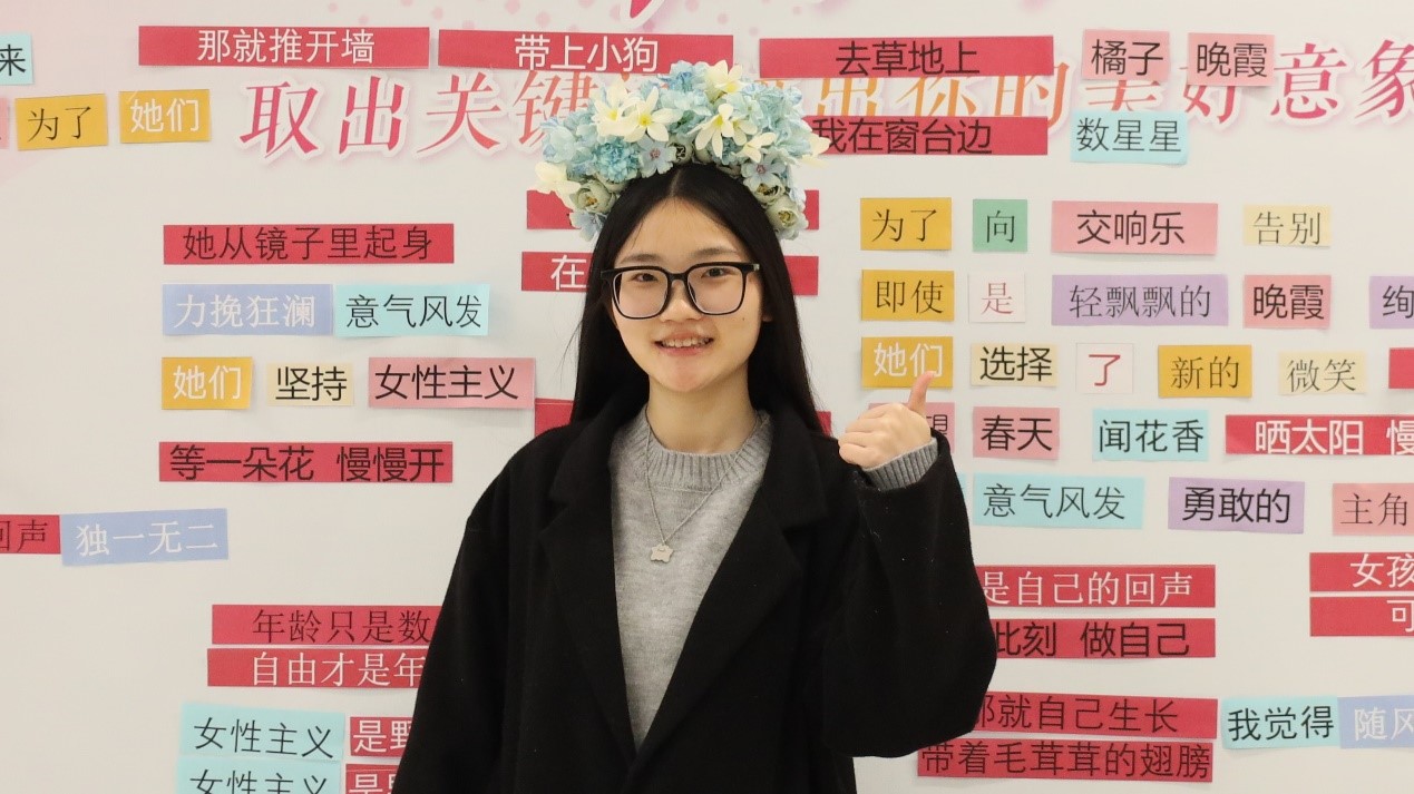 不一会儿,空白的墙面便被诗句填满。“女孩可以不必是花,可以是风”“我在窗台边,数星星”“我是自己的回声,在此刻,做自己”“推开墙,带上小狗,去草地上”……五彩斑斓的词语在晨光里跳跃,仿佛每一位走过的人,都把自己的名字写进了这个春天。