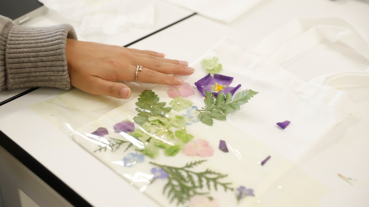 女员工们挑选好心仪的叶片,在纯白的帆布包上精心构图。有人将叶片排成心形,有人拼出花朵的形状,还有人索性随性而为,让叶片自然散落。构图完毕,便用透明胶带将叶片固定在帆布上,接下来是最有趣的环节——拓染。