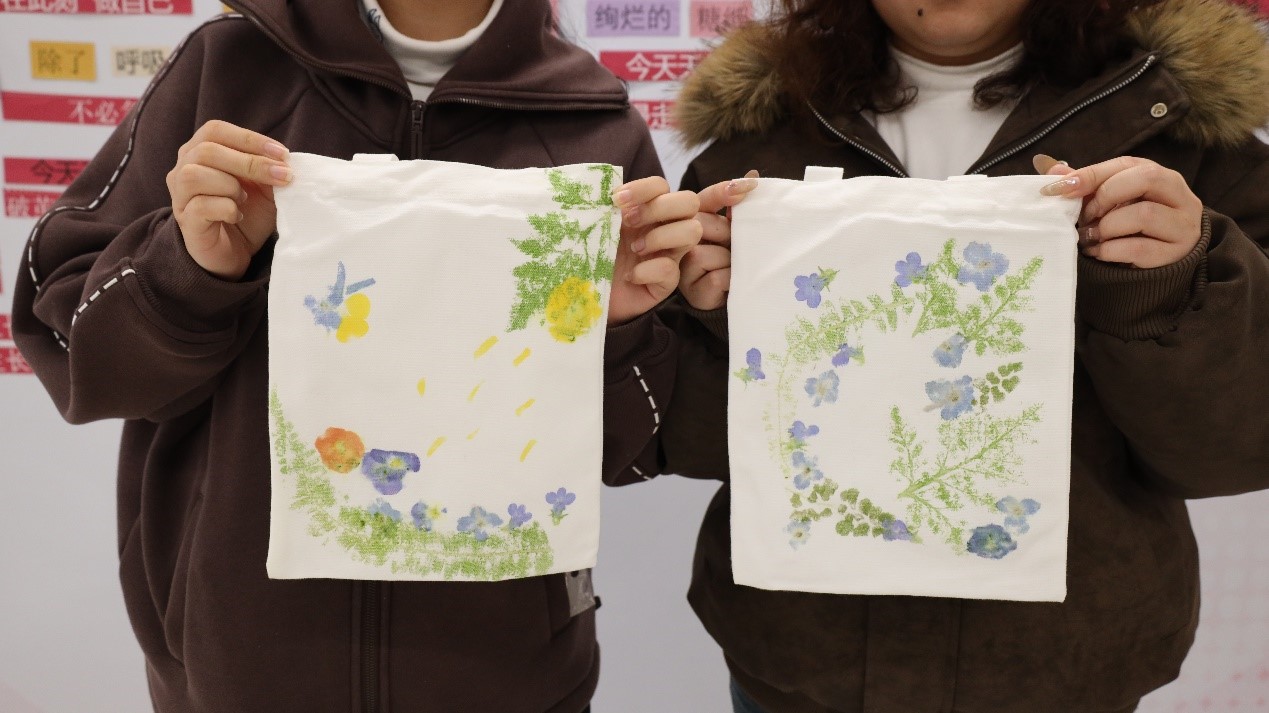 “咚咚咚”“咚咚咚”——小槌起起落落,敲击声此起彼伏,像一场轻快的春日协奏曲。随着每一次敲击,叶片的汁液缓缓渗出,将绿色的脉络、花瓣的轮廓一点点印染在帆布上。起初只是淡淡的印痕,渐渐地,颜色越来越饱满,叶片的形状越来越清晰,仿佛把整个春天都“敲”进了布里。