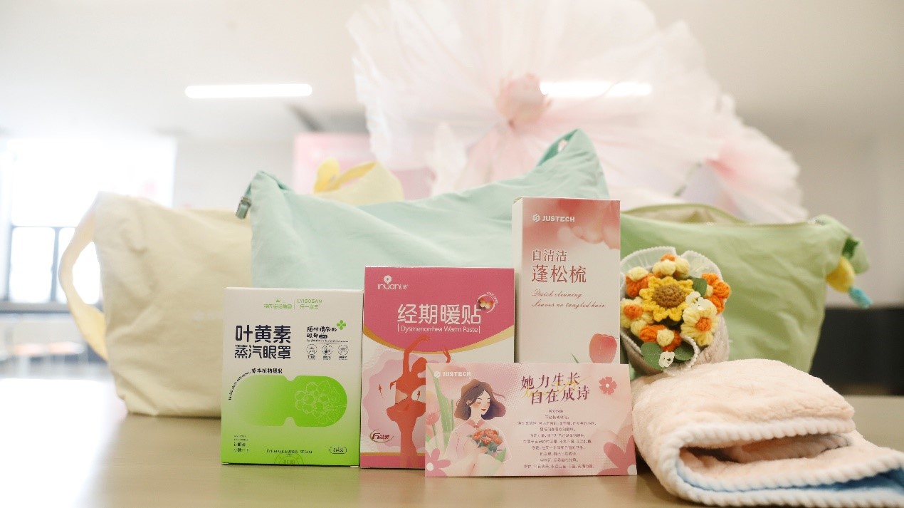 马卡龙色的挎包摞成一片温柔的彩色——雾霾紫、柠檬黄、薄荷绿、抹茶绿,像是把春天的甜品店搬到了现场。蒸汽眼罩、经期暖贴、蓬松梳、洁丽雅干发帽……每一件礼物都透露出细腻的体贴:那些在日常中被忽略的小小需求,都被一一看见,一一安放。